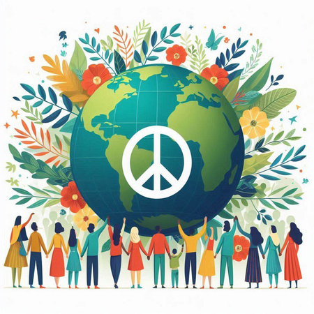 World peace day concept with people around the world. Vector illustration.