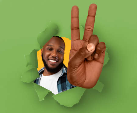 Positive African American guy showing big peace or victory gesture through hole in torn green paper