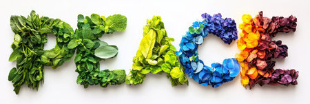 Vibrant Word Peace Crafted From Colorful Petals, Leaves, And Herbs On White Background