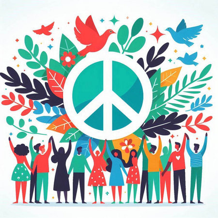 Happy people with peace sign. World peace day concept. Vector illustration.
