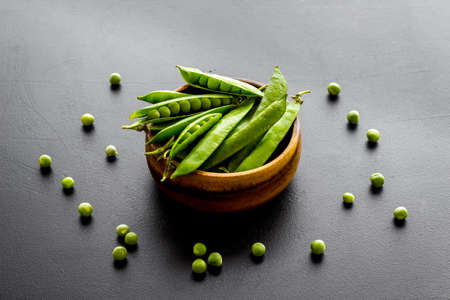 Green pea pods in wooden bowl on the kitchen background