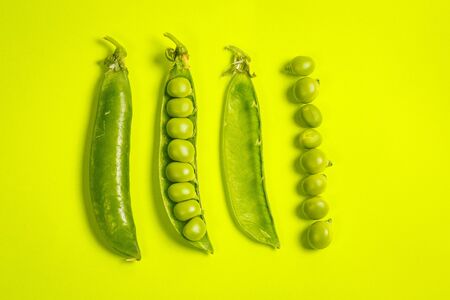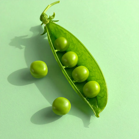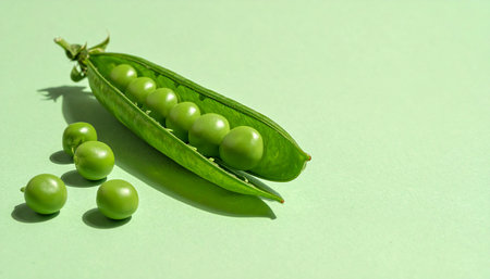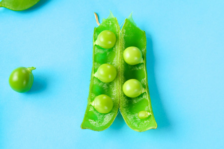 open pea pod with bright green peas on pastel background, macro top-down minimal food photo