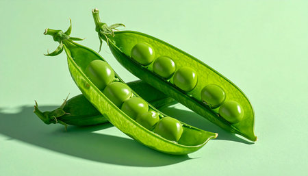 Two opened green pea pods, each containing several peas, are arranged on a light green background with shadows.