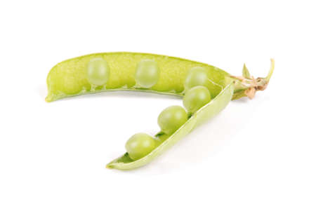 Fresh green pea pod with beans isolated on white background. Sweet pea in close up.