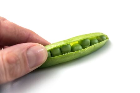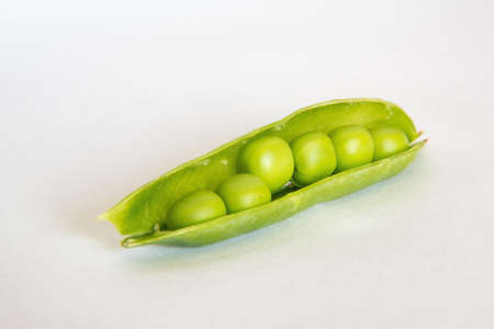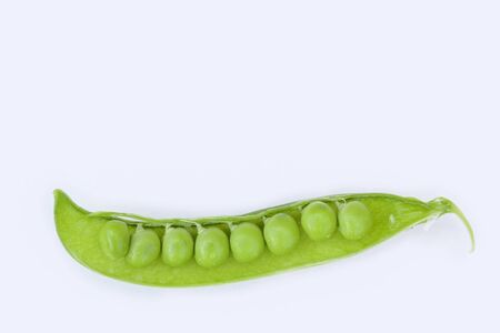 A pod of green peas on a white background. Delicious sweet vegetable close-up.