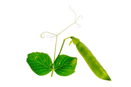 Young shoot and pod of green peas on white background.