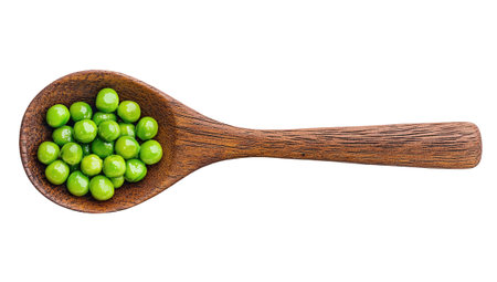 Wood spoon with green peas isolated on white background, top view