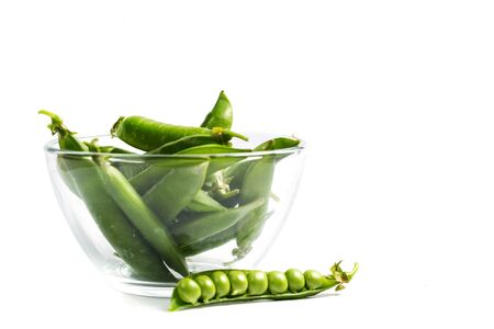 Fresh green peas with pods isolated on white background. Vegetarian food concept