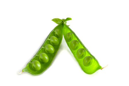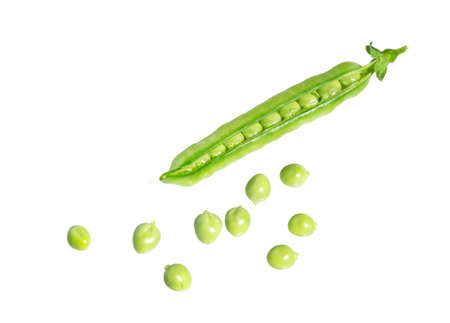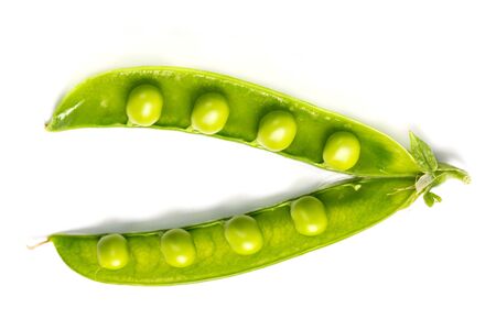 Open pod with peas inside. Green peas in a pod on a white background. Green pea pods on a white background.