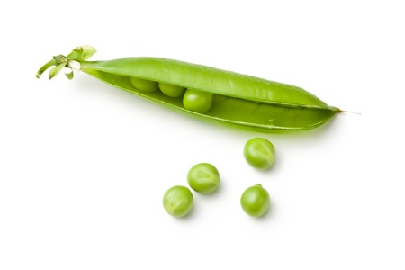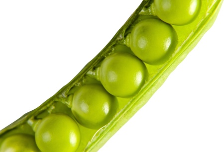 A pea pod revealing peas against white background