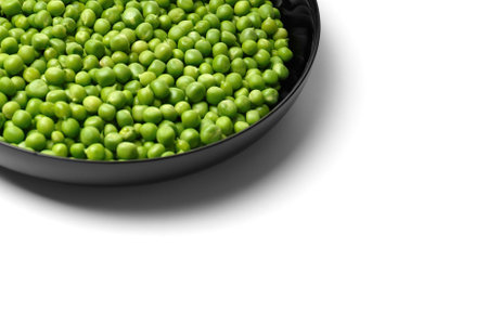 Peeled grains of fresh green peas in a round black plate on a white background, copy space. Vegetable protein, healthy products.