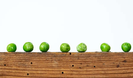 green peas lined up on top of a retro wooden box with white background. copy space for text