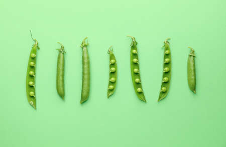Green pea pod with seeds on green background