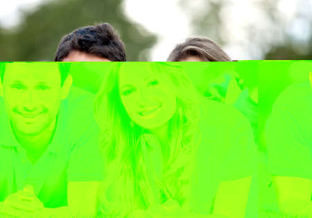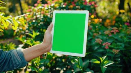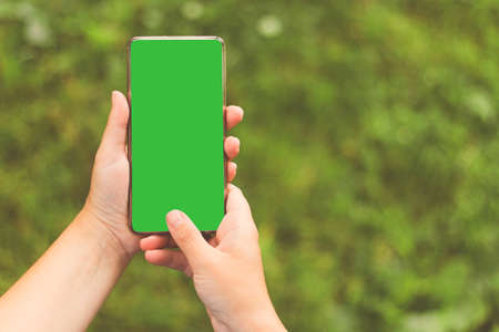 Mockup image of smart phone with green blank screen template, woman hand holding and showing mobile in nature outdoor.