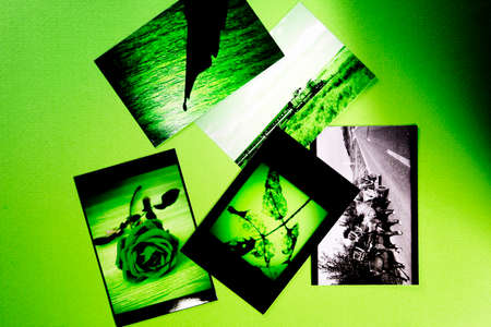 Portrait of positive cheerful girl imagine she photographing landscape wear bright pullover isolated over green color background
