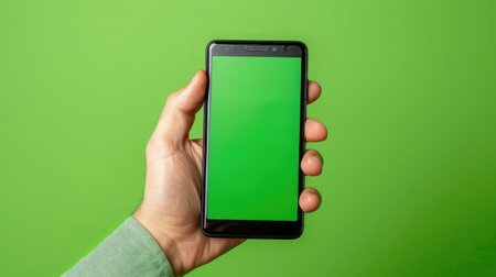 hand holding smartphone showing green screen mobile app advertisement and excited