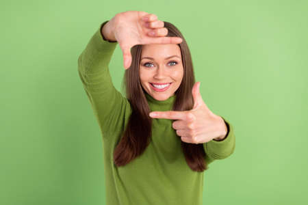 Photo portrait happy woman showing border sign taking photo isolated pastel green color background