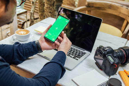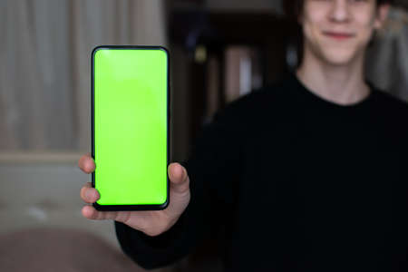 A man holds a phone in his hands with a green screen. Selective focus. People.