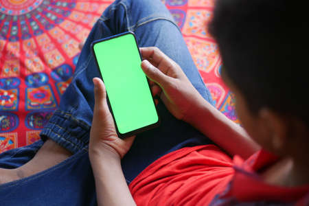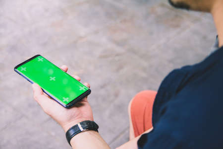 hands holding touching mobile phone with blank copy space on green screen for your text message Selective focus