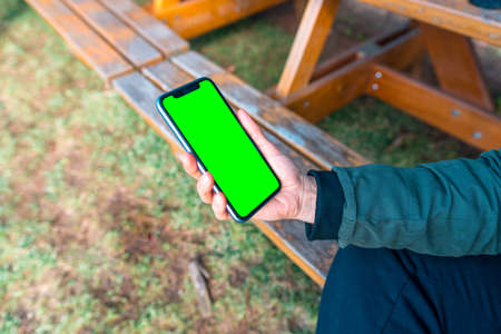 Male hand holding smartphone outdoors, screen is filled by chromakey