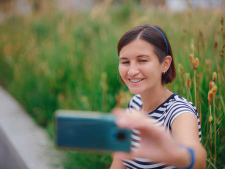 Beautiful brunette woman wearing turquoise t-shirt standing on city park, outdoors taking horizontal photo with her smart phone.