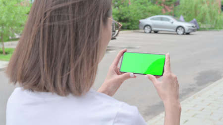 Female tourist holding mobile phone with green chromakey screen against blue sky for mockup