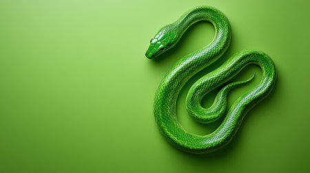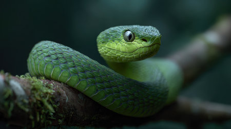 A captivating close-up image of a vibrant green snake elegantly coiled on a branch, showcasing its intricate scales amidst lush greenery, evoking a sense of tranquility and wild beauty.