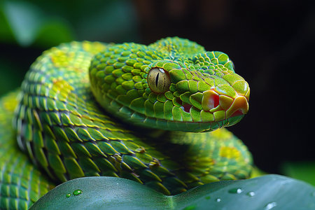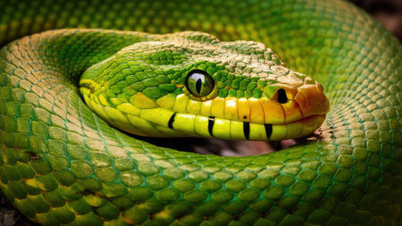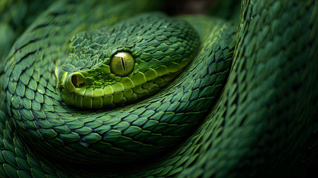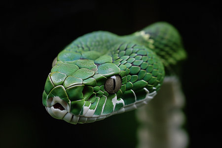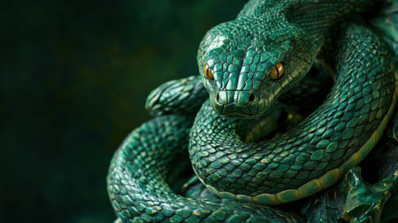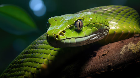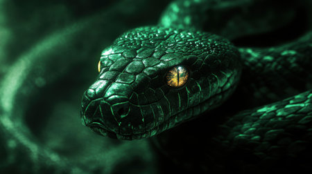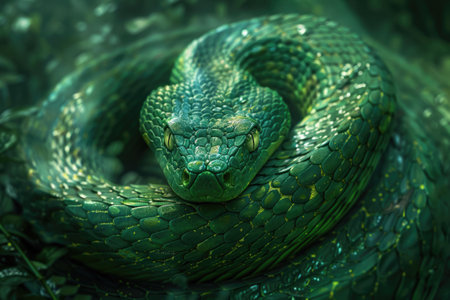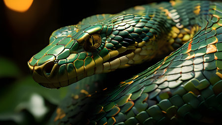 A striking, detailed close-up captures a coiled green snake in dramatic lighting. Its scales are vividly textured and its eyes hold a captivating, intense gaze, showcasing reptilian beauty.