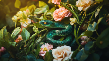 Snake slides between foliage, penetrating eyes, hypnotizing scales., generative AI
