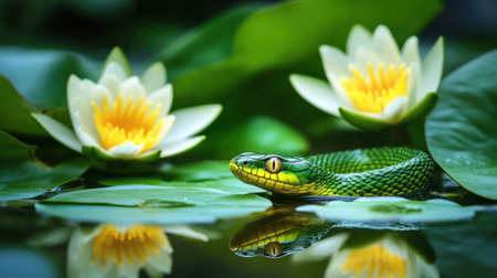 Detailed green snake and water lily arrangement, symbolizing harmony and serenity in nature.