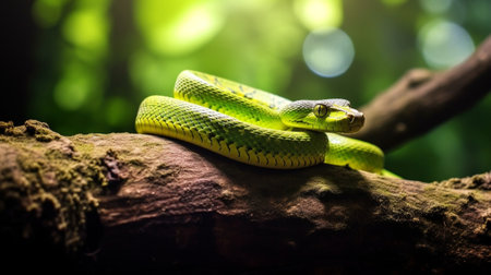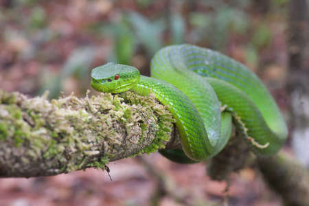 Green pitviper snake on a tree branch in the forest.