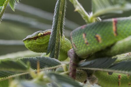 Green pit viper in the rain forest. Close up of green pit viper.