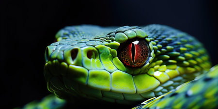 Intense closeup of a green pit viper, its golden slit eyes and bright scales glowing under the light, with dark background emphasizing details