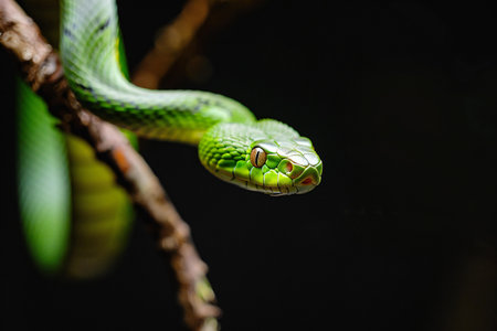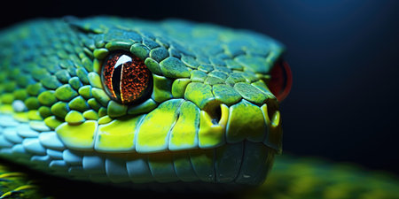 Green viper with tongue out, dark background, macro shot, intense and captivating