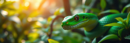 Green snake resting among lush foliage in a tropical environment under soft sunlight