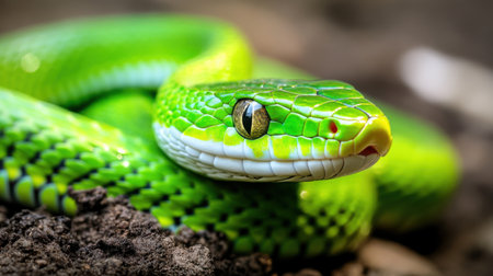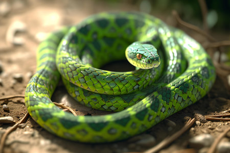 A vibrant green snake displays its striking scales as it rests on the earthy ground. The sunlight highlights its beautiful patterns, showing its keen eyes and unique features