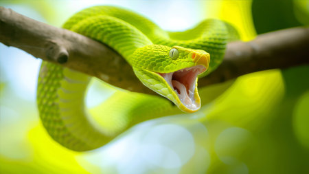 Green tree python, a non-venomous snake native to new guinea, indonesia, and australia, is coiled around a branch, displaying its vibrant green scales and yellow mouth