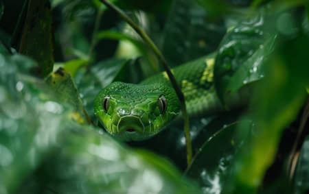 The captivating gaze of a green snake lies in ambush among dense foliage, embodying the essence of stealth and precision