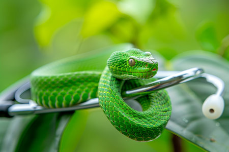 The striking green snake gracefully wraps itself around a shiny stethoscope, contrasting with the lush green leaves in a peaceful natural setting.