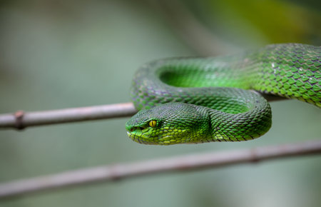 Green pit viper on a tree branch in the forest, Thailand.
