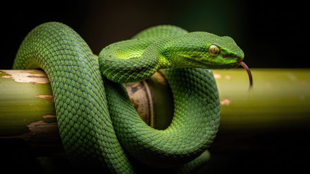A vibrant green snake is coiled around a bamboo branch, its tongue extended. The image displays a close-up composition with smooth textures, contrasted against a dark background. The lighting highlights the subject, suggesting an outdoor environment. Suitable for editorial and commercial applications.