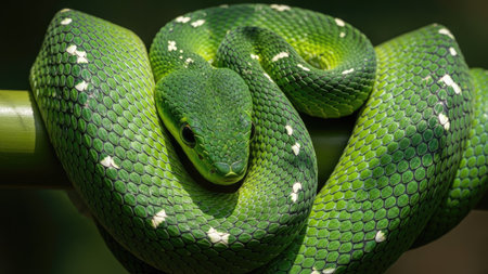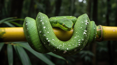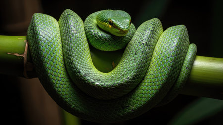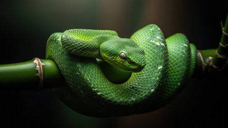 A vivid green snake is coiled around a bamboo branch. The image highlights the snake's textured scales and captivating eye. The composition showcases rich green hues against a dark backdrop, creating a sense of depth and contrast. This photograph is ideal for illustrating wildlife or nature themes in various commercial applications.