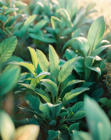 Close-up of vibrant green leaves in a lush garden highlighting intricate textures and natural beauty during daytime