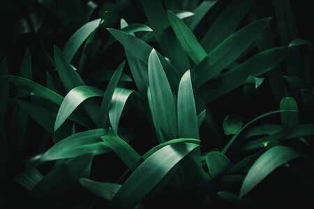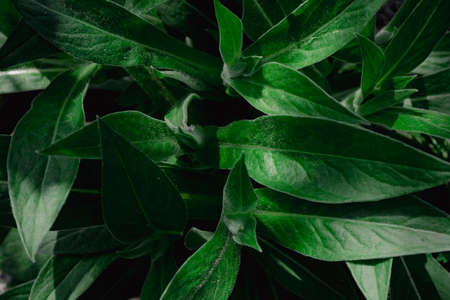 Green background of leaves in dark oblong colors. spring flowerbed. selective focus.