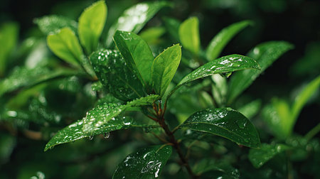A close-up shot of vibrant green leaves, showcasing their detailed vein patterns and glistening water droplets, creating a refreshing natural scene.