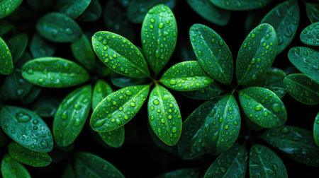 This image presents a close-up view of lush green leaves, likely outdoors in a natural setting. The leaves are covered in glistening water droplets, creating a fresh and vibrant appearance. The composition emphasizes texture and pattern, offering potential uses in nature-themed projects or editorial content.