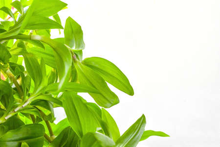 Close up of tradescantia plant on white background with copy space. Fresh green leaves