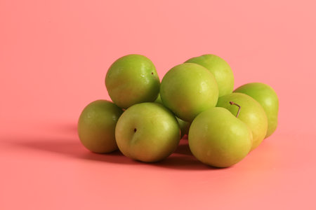 Green cherry plum on a pink background. Creative minimalist style. healthy food