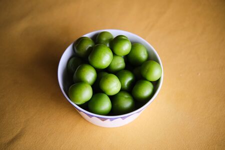 Fresh and green plums. Bowl of fresh green plums.