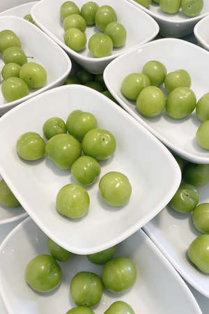 Green plums ready to serve on white plates in restaurant